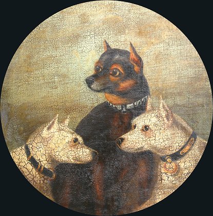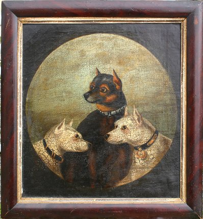 EARLY PORTRAIT OF MANCHESTER TERRIER AND 2 WHITE TERRIERS O/C: 16 1/2'' x 14 1/2'', period frame with wear, 19'' x 17 1/2''.