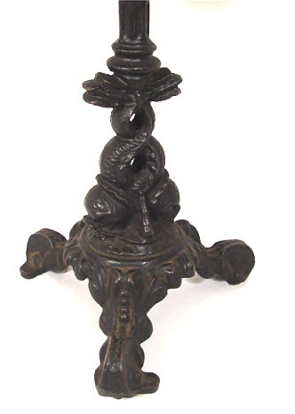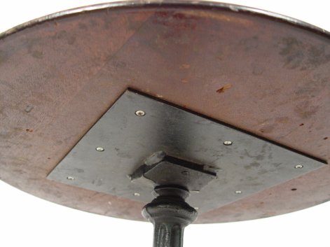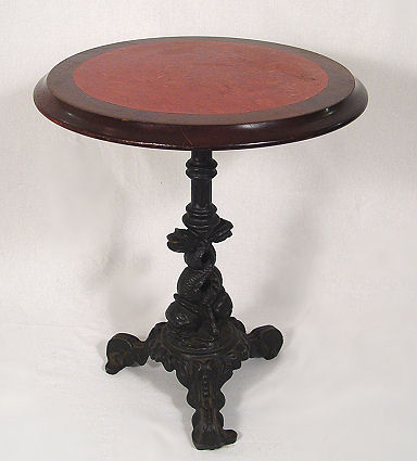 CAST IRON SIDE TABLE CA. 1910's: Round wood top on a dolphin cast iron base. 28''h. x 23'' dia.