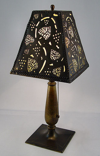 VINTAGE MILLER PIERCED METAL AND SLAG GLASS DESK LAMP: The leaf motif pierced shade is lined in caramel slag glass. The base is brass and iron and signed EM & Co with illegible numbers. Single socket with long acorn ended pull chain. 19''h., the four sided shade is 8'' dia.