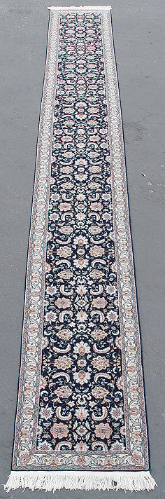 HAND KNOTTED PERSIAN CARPET RUNNER: Floral pattern on blue field, 20' long x 30''. Suitable as a stair runner. Companion runner at lot 249