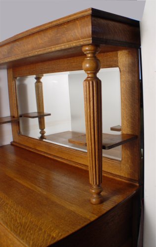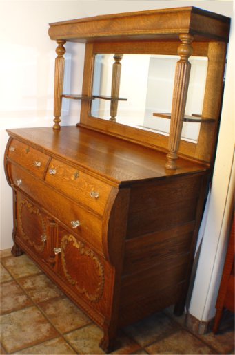 GOLDEN OAK MIRROR BACK SIDEBOARD: Beveled mirror and reeded column supports on the upper section. The lower section has 2 curved drawers over 1 full length drawer over cabinet doors. Glass knobs throughout. 65''h. x 49'' x 24''.