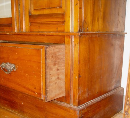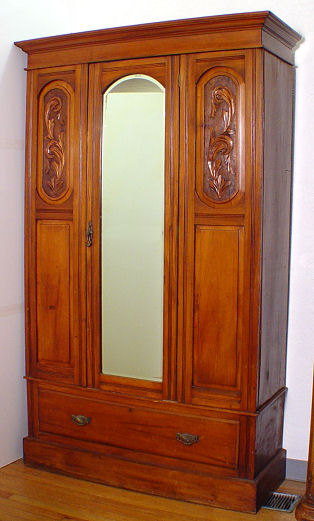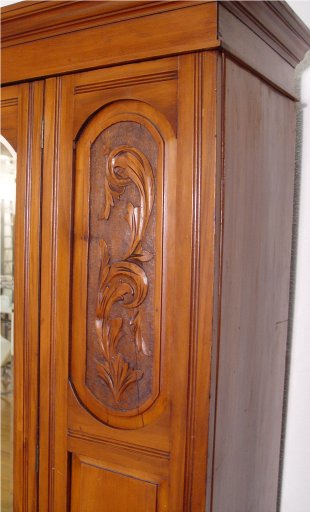 EARLY 20TH C CARVED ARMOIRE: Carved panels centering the single door. The door is fronted with an arched beveled mirror. Full length drawer across the bottom. 79''h. x 45'' x 16''.