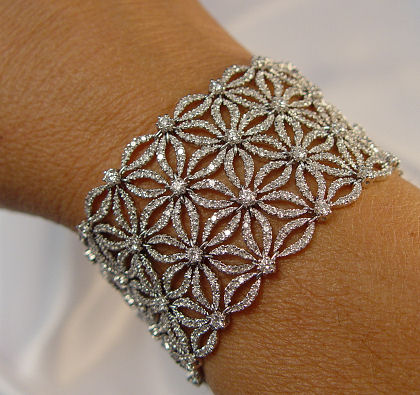 11ctw DIAMOND LACE BRACELET: Wide handmade filigree bracelet in a floral pattern giving the appearance of lace, 18k white gold purportedly with platinum prongs, 7''l, unique slide clasp with safety latch, 59 grams. Est. $8000/9000**