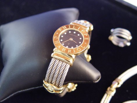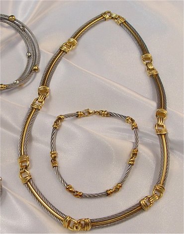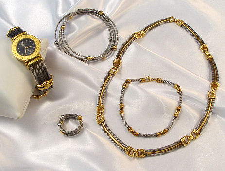 TRAY LOT OF PHILIPPE CHARRIOL JEWELRY: Five pieces of steel cable and 18k gold jewelry to include, a lady's wrist watch - Swiss made, water resistant, serial 7007901 05426, cuff bracelet of twisted cables, mariner link chain and safety; matching bangle and ring of spring cable set with white and yellow gold beads; twisted wire link and gold bracelet 7''; and a 16'' necklace comprised of eight curved links of twisted cable and gold bar joined by simple gold links. Sold as a lot.