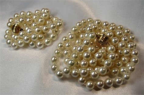 TWO STRANDS OF 6.3MM PEARLS: Necklaces measuring 33'' & 16'' of well matched cultured pearls, creamy white luster, double knotted, ribbed gold ball clasps 8.3mm on the 16'' and 9.2mm on the 30''.