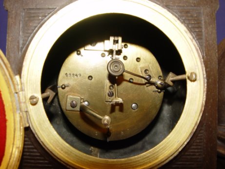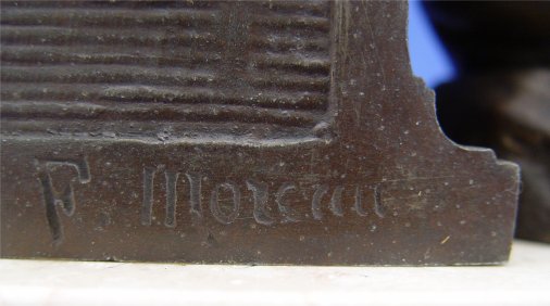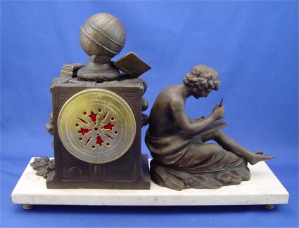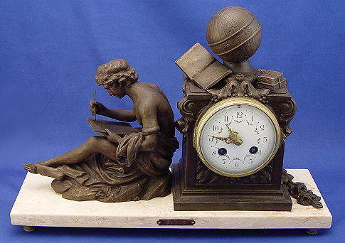 FRENCH FIGURAL CLOCK AFTER F. MOREAU: Mounted on a marble plinth the clock id surmounted by books, a globe and rose garland. A separate figure of a scholar sits net to the clock. Made in France. The dial has hand painted floral swags with restored wear at the key hole. 8 day time and strike, in good working order. 11 1/2''h. x 10'' x 5 1/4''.