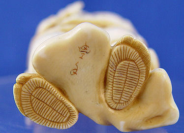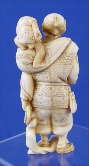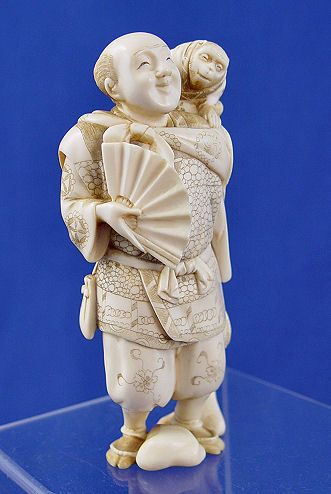 CHINESE CARVED IVORY FIGURE OF MAN WITH MONKEY: Very smiley gentleman with monkey on his shoulder. Happy Harvest year (translation) inscribed in bottom. 5''h.