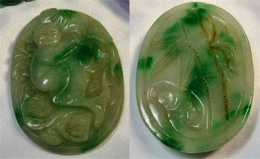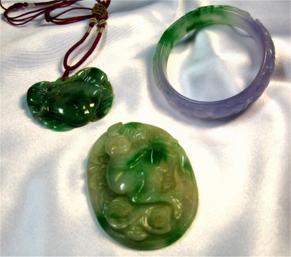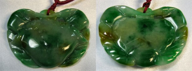 3 PIECE LOT OF JADEITE JEWELRY: To include, variegated green pendant carved into the shape of a crab, 2 1/8'' x 1 1/2'', on a red cord with adjustable slide back. Carved bangle of lavender and moss green jade, inside dia. approx. 2 3/8''. Carved disk with man riding a fish on the front, hole at top for cord, 3 1/16'' x 2 1/16''.