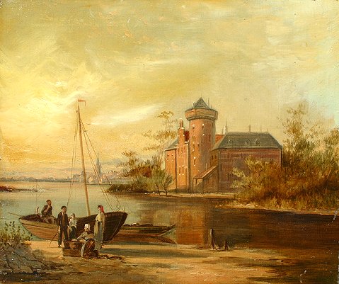 19TH C. O/C EUROPEAN LANDSCAPE WITH FIGURES: 12'' x 14'', no visible signature, newer frame with wear.