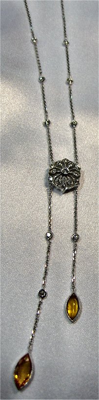 1.51ctw YELLOW SAPPHIRE & DIAMOND NECKLACE: Lovely lavalier necklace with diamond encrusted center filigree flower with two marquise cut yellow sapphire dangles, spaced along the 18k white gold chain are bezel set diamonds, approx. 1.51ctw of sapphires and .55ctw of diamonds. 16'' necklace plus 3'' dangle, 4 grams.