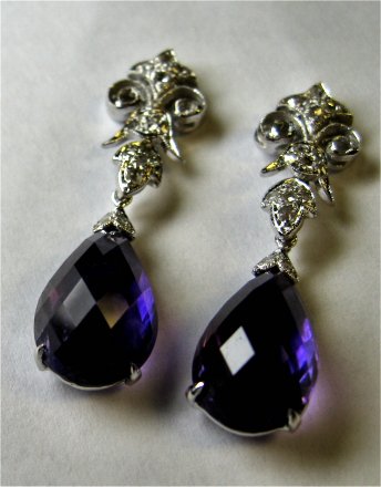 11.5CTW AMETHYST DANGLE EARRINGS: Large briolette cut amethyst with deep purple color, approx. 11.59ctw, set in 14k white gold with 36 old cut diamonds, approx. .27ctw. 1 3/8''l., 6 grams.