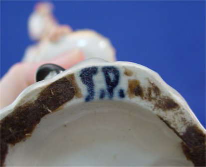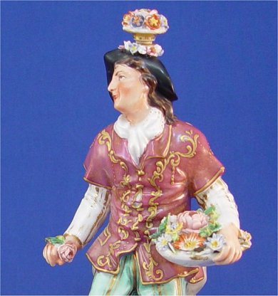 PAIR PORCELAIN FIGURAL SCENT OR TOILET WATER BOTTLES: Man and woman in period costume with intricate flowers in baskets. Heavy in weight, as in old Meissen. Marked in blue underglaze S.P. 10''h.