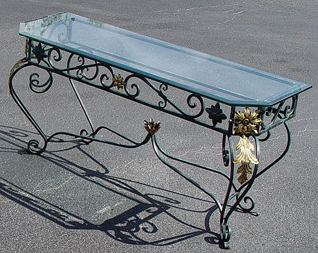 IRON AND GLASS CONSOLE TABLE: Contemporary glass top sofa or console table, 30 1/4''h. x 65 1/2'' x 20 1/2''. Go for a pair, the match is lot 343.