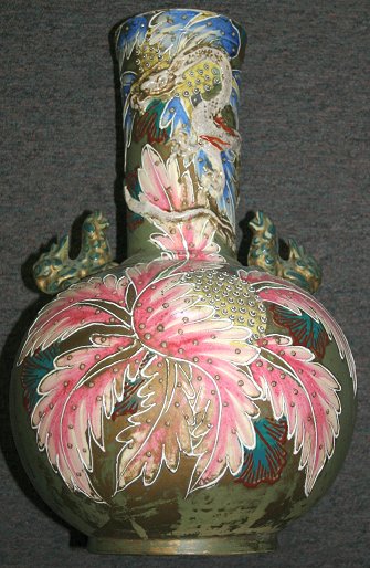 MORIAGE DRAGON VASE, 16'' H.: Applied dragon decoration throughout, dragon handles. Some very minor chips to base.