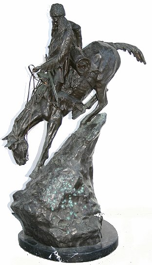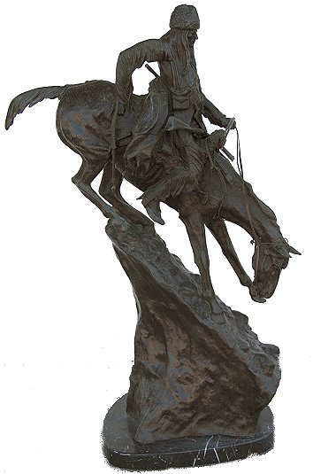REMINGTON (AFTER) MOUNTAIN MAN BRONZE: 29'' h., impressed signature, affixed to a polished black marble plinth.