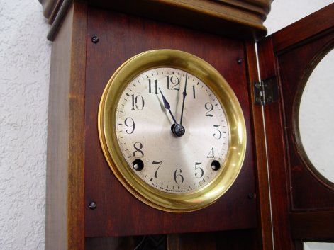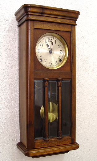 A DIMINUTIVE ANSONIA WALL CLOCK: Mahogany case with beveled glass panels, 4'' metal dial with Arabic numerals, gong strike, key wind. Key and pendulum included. 18 3/4''h. x 8'' x4 1/4''.