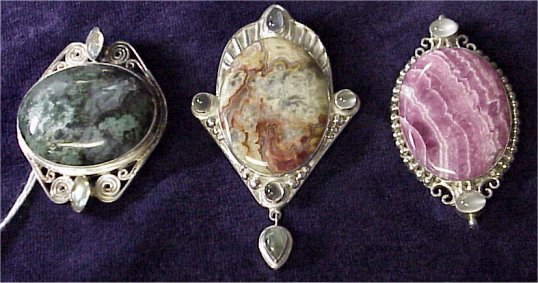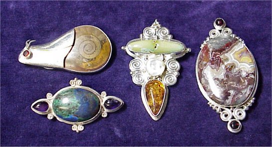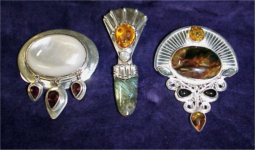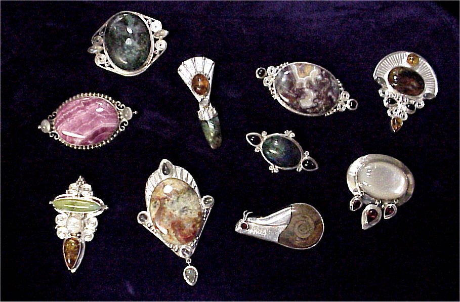 SAJEN OFFERINGS STERLING JEWELRY, ESTATE LOT: 10 pin/pendants, one in the shape of a snail. 2nd of 5 lots in this auction, more to come next month! All sterling with many kinds of semi precious stones.