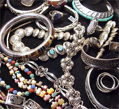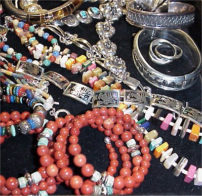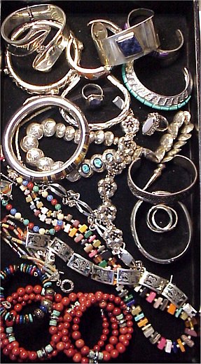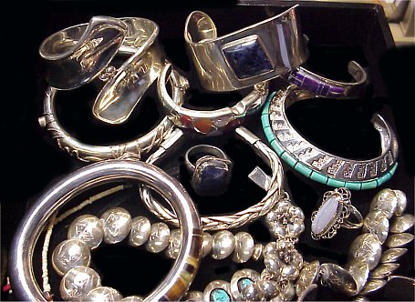ESTATE LOT OF STERLING & STONE JEWELRY: 23 pcs to include, cuff bracelet set with purple stones marked M Spencer Sterling, 25 grams; bangle with applied leaf motif and 3 amethyst marked India, 29.5 grams, 2 3/4'' opening; matching red rock, turquoise and silver spring bracelets, no mark found; inlaid cuff with hinged ends, marked China 925, 56 grams; cuff set with turquoise marked CR, 64 grams; multi colored stone necklace and three multi colored stone bracelets; reversible puffed disk bead necklace with etch work and turquoise marked RB Sterling, 18''l., 48.5 grams. Mexican makers to include, ATI with a hinged bypass bracelet 60 grams, hinged bangle 56.5 grams, matching cuff and ring set with blue stones bracelet 37.5 grams ring 11 grams, scroll link bracelet 27 grams, 8''l.; CII with a 5/8'' cuff bracelet 39 grams, bangle inlaid with tiger eye 3 1/2'' overall with 2 3/4'' interior 71 grams, floral link bracelet 7 1/2'' 44.5 grams, triple band ring size 10 14 grams; cuff bracelet marked HOB 56.5 grams, and