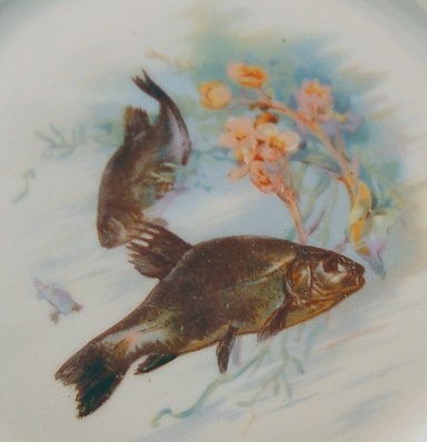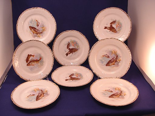 SET OF 8 VICTORIA & CARLSBAD FISH PLATES: Transfer image of aquatic life, 8 3/4''. Minor wear to gold.