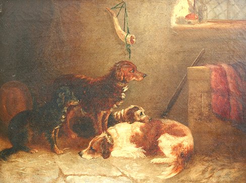 19th C. PAINTING AFTER ARMFIELD, WAITING FOR MASTER: O/C, 11'' x 14'', pierce carved period frame, 15 3/4''.
