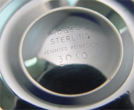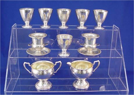 STERLING EGG CUPS, CREAMER & SUGAR AND URNS: 1) Set of 6 Webster Co. sterling egg cups or cordials, 2 5/8''h. 2) A Rogers sterling cream pitcher and open sugar bowl, 3''h. 3) Pair of Fisher Silversmiths cigarette urns with trays.