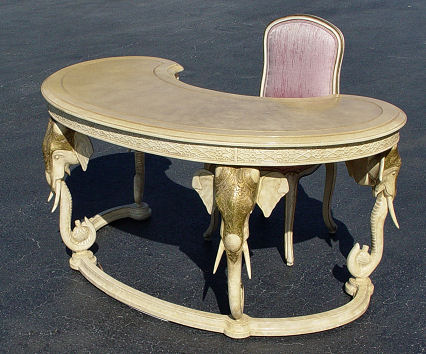 CARVED ELEPHANT DESK & CHAIR: Painted finish on mahogany. Kidney shaped desk with carved elephant leg supports, 29 1/2''h. x 60'' x 22''deep at the center. Chair seat is 19''h., overall 37 1/2''h. and seat is 16''d.