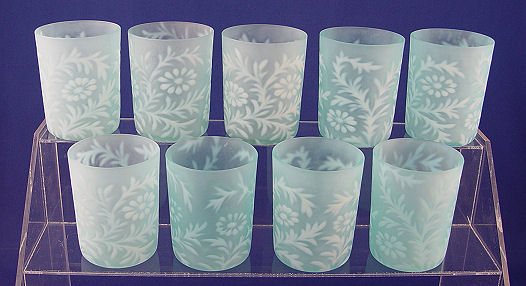 9 FENTON BLUE OPALESCENT DAISY AND FERN GLASS TUMBLERS: Satin glass, 3 3/8''h. free of chips or cracks.