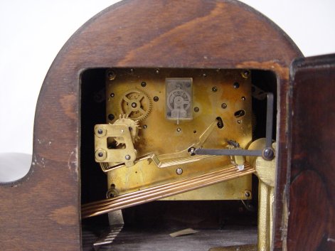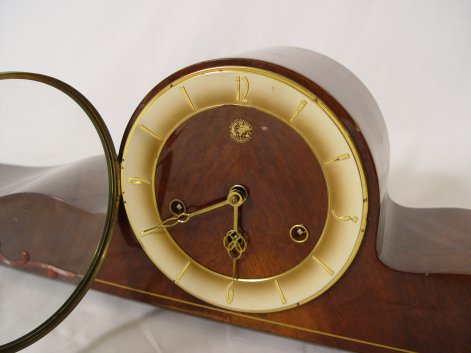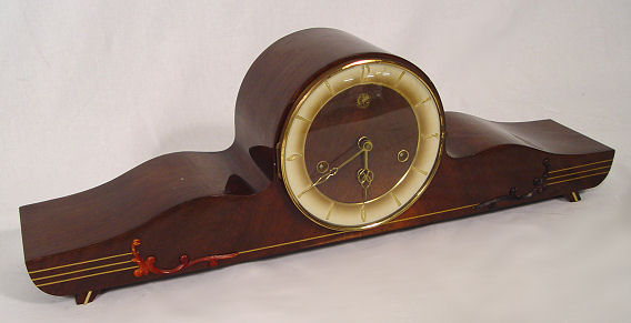 GERMAN ART DECO MANTLE CLOCK: Westminster chime, key wind with key included. High gloss mahogany humpback case. 8 1/2''h. x 27 1/2''l. x 5 1/8''.