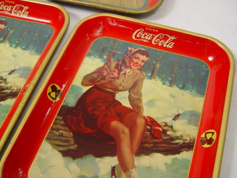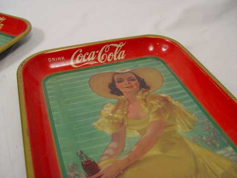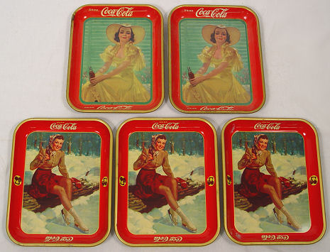5 ESTATE FRESH VINTAGE COCA COLA TRAYS: 3 are 1941 girl, on ice skates. 2 of the trays are 1938, girl in yellow dress with straw hat. They are marked ''The American Art Works inc. Coshockton Ohio Made in USA'' and of course ''The Coca Cola Company''. 13 1/4'' x 10 1/2''. Please call for condition.