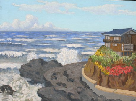BEACH, Warren, (American, 20th C>): House on Coast, O/C, 18'' x 24'', monogrammed LR, framed, 22'' x 28''.