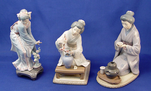 3 JAPANESE INFLUENCE LLADRO FIGURES: 1) #5122 ''August Moon'', retired in 1993, 8.5''h. 2) #1449 ''Mayumi'', 9.5''h. 3) #4840 ''Oriental Girl'', 7.5''h.