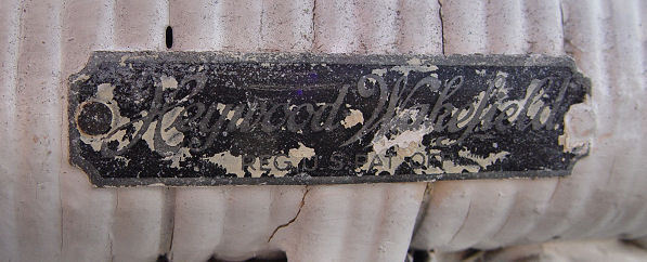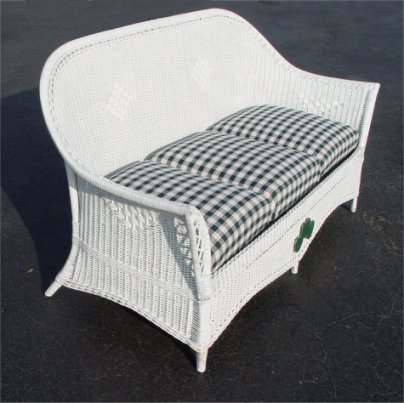 HEYWOOD WAKEFIELD WICKER SOFA: Painted white, spring cushion seat. Metal name label on the back, later wood hearts applied on the front. 35''h. x 72''l. x 25'' deep.