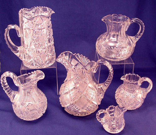 GROUP OF 6 AMERICAN BRILLIANT CUT GLASS PITCHER: Part of the estate collection we are offering today. The largest is 8 1/4'', the smallest is 3 1/3''. No visible signatures, all are high quality.