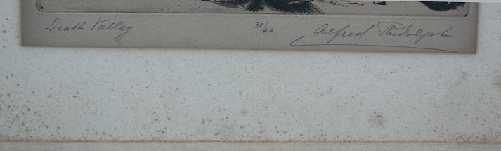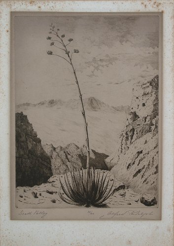 RUDOLPH, Alfred, (American, 1881-1942): ''Death Valley'', Etching, 11 /34'' x 8 3/4'' impression size, 16'' x 11 1/8'' with margins, pencil signed LR, tiled LL, # 31/40, original mat and frame, 19'' x 15'', old R.H. Macy & Co. label verso.