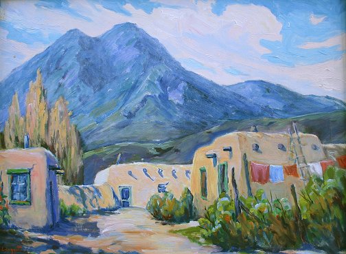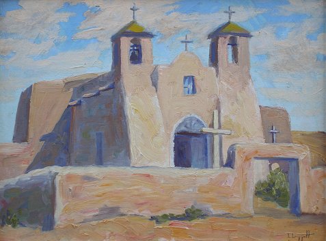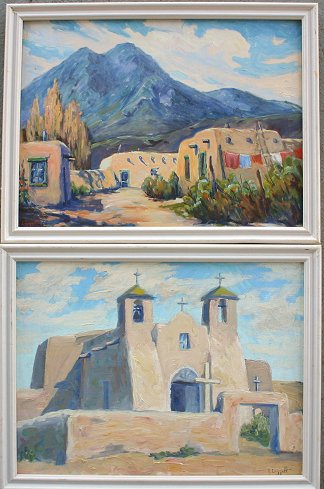 LEGGETT, Lucille (American, 1896-): Pair of Southwestern Landscapes, ''Church at Ranchos de Taos'', ''New Mexico'', O/CB's, 12'' x 16'', both pieces titled verso, signed LL and LR.