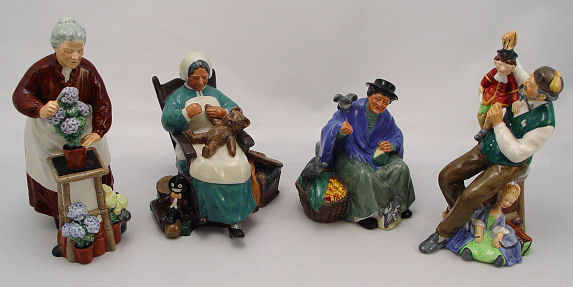 4 ROYAL DOULTON FIGURINES: Tuppence a Bag HN 2320 5 1/4'', Nanny HN 2221 5 1/2'' , Flora HN 2349 8 1/8'', The Puppetmaker HN 2253 8''. No chips or cracks noted, small glazed over firing fault at Flora's front collar.