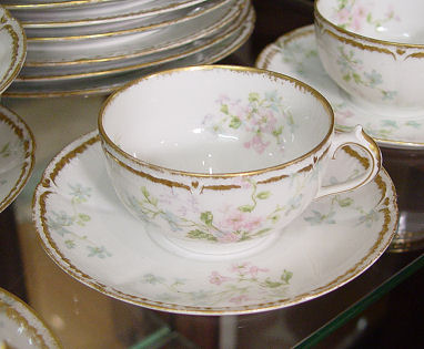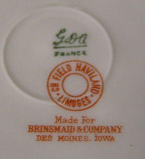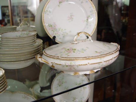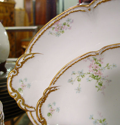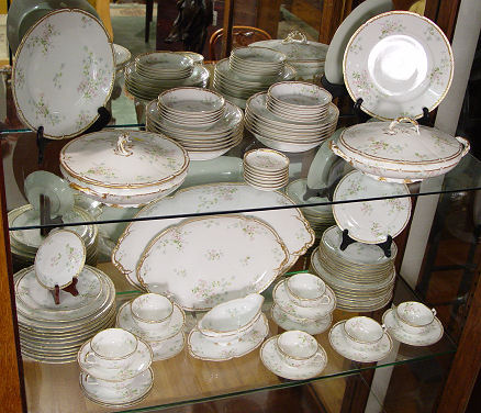 FRENCH HAVILAND LIMOGES FINE CHINA SERVICE: Made for Brinsmaid & Co. Des Moines, Iowa. The pattern was designed by artist Millie Seems Jones, great aunt of the consignor. 83 pieces to include large 19.25'' platter, 14.5'' platter, round covered vegetable, oval covered vegetable, gravy boat with attached underplate, 12 dinner plates, 9 salad plates, 8 bread plates, 12 dessert bowls, 12 soup bowls, 9 cups. 9 saucers, and 7 butter pats.
