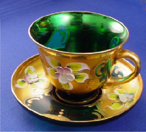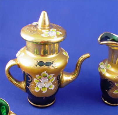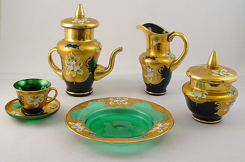 FANCY ITALIAN GILT EMERALD GREEN GLASS SUITE: 21 piece service for 6 to include the pot, cream pitcher, covered sugar, 6 cups and saucers and 6 dessert plates. Heavy gold decoration on deep rich emerald green.