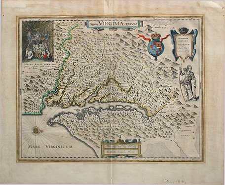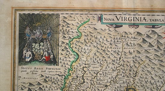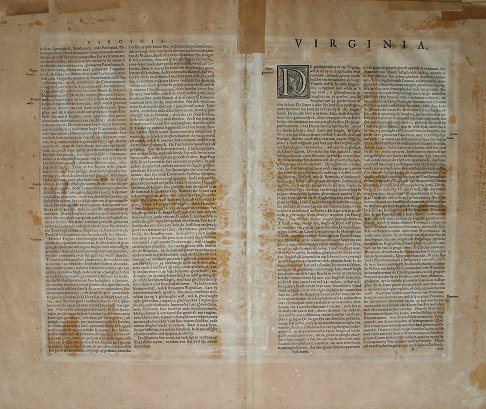 OLD MAP OF VIRGINIA: Age unknown, hinged, full paper size 19'' x 23'', impression size 15'' x 19'', text verso, crease from atlas fold, staining visible, newer frame, 23'' x 26''.