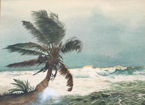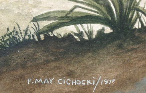 CICHOCKI, F. May, (American, 20th C.): Crashing Surf Against Windblown Palm, W/C, 10 1/2'' x 14 1/2'' sight size, signed LL, dated 1978, worn frame, 17 1/2'' x 21 1/2''.