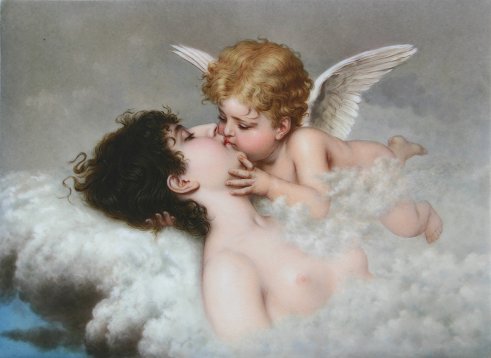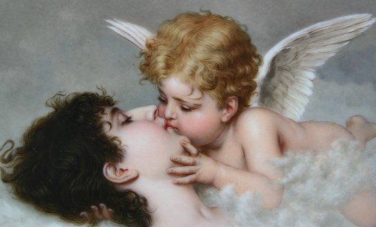 KPM QUALITY PLAQUE, ''ANGELS KISS'': 5 1/2'' x 7 1/2'', impressed numerals, taped partial KPM paper label, circa 1900. Est. $1800/2500**