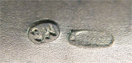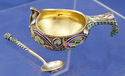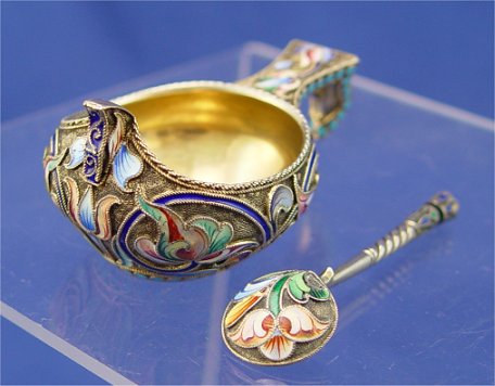 RUSSIAN ENAMEL KOVISH SALT AND SPOON: Both marked MC for Marie Semenova. Silver content 84. Moscow 1908-1917. The salt cellar is 3/4''h., 2 1/2''l. The spoon is 2 1/2''.
