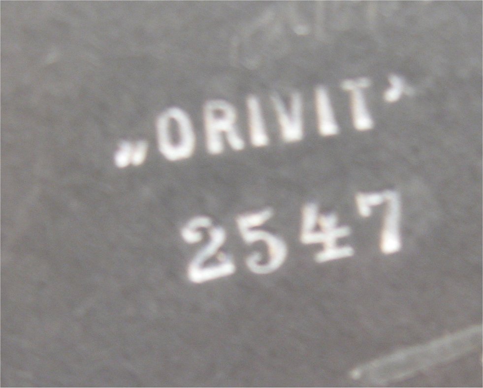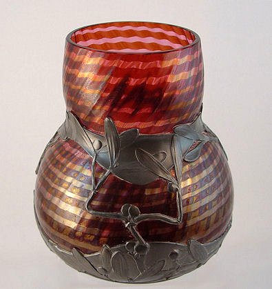 LOETZ ORIVIT PEWTER MOUNTED ART NOUVEAU VASE: Red iridescent spiral art glass. The Nouveau leaf and berry design pewter overlay is stamped Orivit 2547. 7''h. 3'' at the rim. Free of chips or cracks. Est. $800/1200**