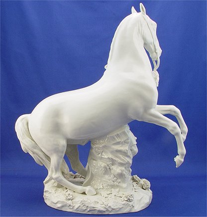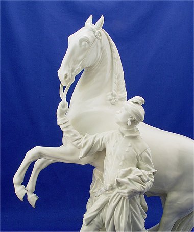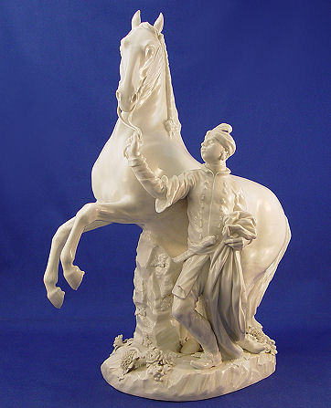 MEISSEN BLACKAMOOR & HORSE WHITE PORCELAIN FIGURAL GROUPING: Crossed swords mark. Approx. 17 1/2''h., 15 1/2''w. x 8 1/2''d.
