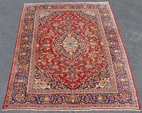 HAND TIED PERSIAN CARPET: Approx. 8'2'' x 11'2'', red ground with central blue medallion.