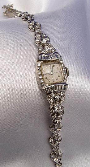 LADY'S PLATINUM & DIAMOND DRESS WATCH: Platinum wrist watch with case edged in round and baguette diamonds, bezel and prong set diamonds to lugs leading to heart shaped links set with round brilliant cut diamonds, case without works weighs 24.5 grams. 17 jewel works by Precimax Watch Co., currently keeping time. 7''l., hidden safety latch plus safety chain.