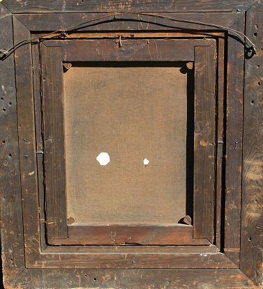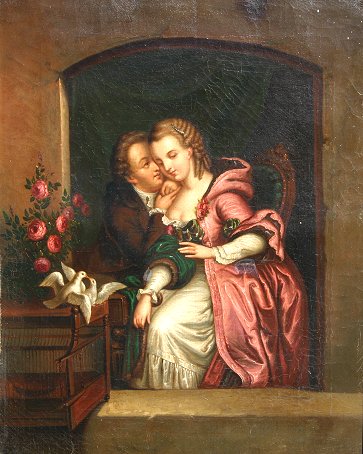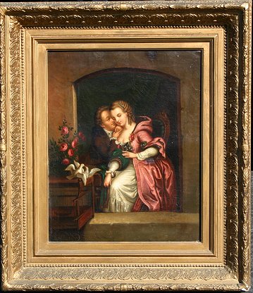 UNSIGNED 19TH C O/C COURTING SCENE: Depicts amorous couple, with symbolic doves on window sill, 18'' x 14 1/2'', heavy gilt period frame with overpaint and wear, 26'' x 22 1/2''.