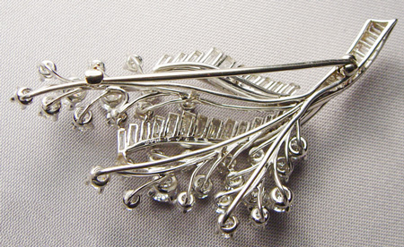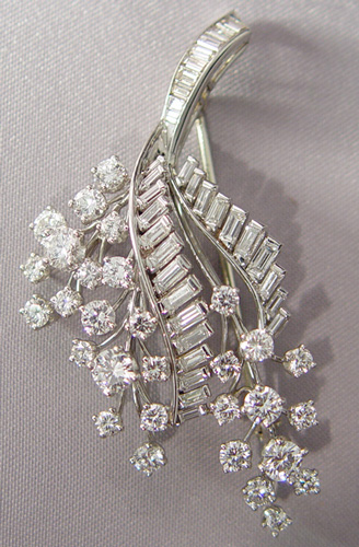 5CTW DIAMOND & PLATINUM FOLIATE SPRAY BROOCH: Polished platinum pin set with 30 round brilliant cut diamonds and 33 straight baguette cut diamonds, totaling approx. 4.92ct, color FGHI clarity VS1-VS2, marked Platinum 48943, 2 1/4''l., 16.2 grams. Sold with original box from Josehps of Des Moines Iowa and a 2003 appraisal from Washington Iowa, replacement value $9800.