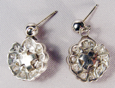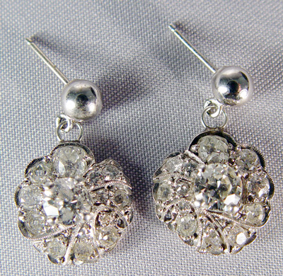 ESTATE DIAMOND EARRINGS: Pendants of platinum set with approx. 2.58ctw of diamonds, Old Euro cut stones of approx. 1/2ct each and old mine, round brilliant and round single cut stones the balance accenting flash. Currently on 14k white gold simple ball post earrings as flashing dangles, no backs, overall 7/8''l., 6.3 grams. Sold with current Florida Diamond Appraisers appraisal, retail replacement value $4650.