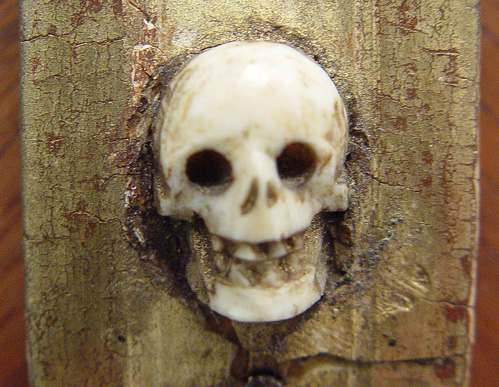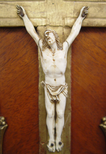 IVORY AND BRONZE CRUCIFIX: 17th C. mission ivory carving of Christ mounted on a wood cross framed in later 19th C. bronze. 19 7/8''t. x 10 1/2'' overall. Est. $1200/1500**